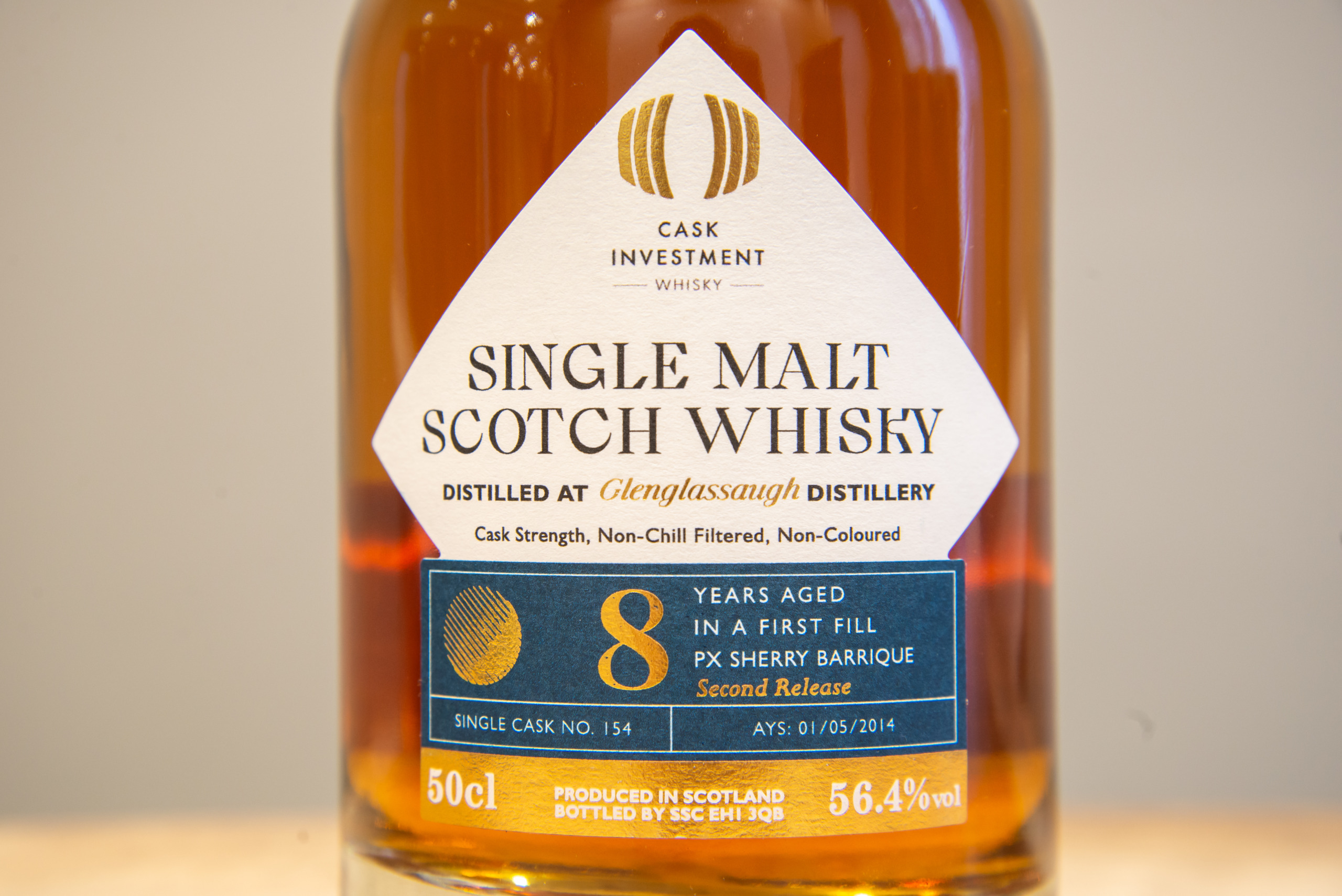 カスクストレングス(加水処理等を施さない樽から出したままのアルコール度数の原酒)である点が挙げられます。前回、弊社でボトリングした「アードモア12年」は、飲みやすさを重視して加水を行いました。ですが、今回はボトリング前に社内で試飲会を行った際、PXシェリー樽熟成のグレングラッサという原酒の美味しさを最大限引き出すには、カスクストレングスが良いという結論に至りました。