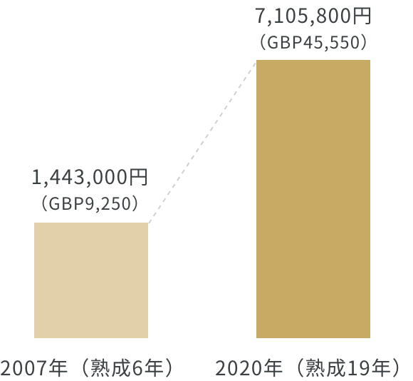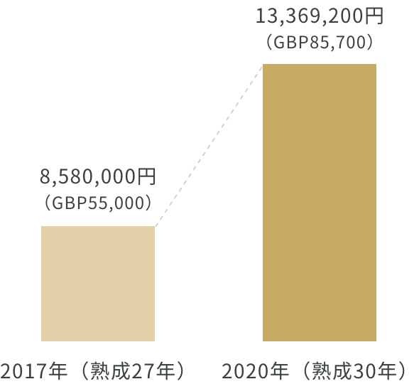 平均購入単価は、GBP(ポンド)で約GBP5,000〜であり、日本円に換算すると約750,000円〜3,000,000円のカスクが全体の約70%を占めています。