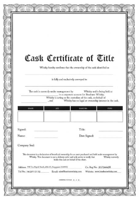 サプライヤー(樽保管会社)より発行される所有権証明書に、ご購入された樽の詳細情報や名義などの記載がございます。