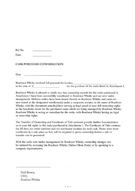 個人名義、法人名義どちらでも可能です。また、共同名義でのご購入も可能ですが、Certificate of cask(樽の所有権証明書)については共同名義で記載されます。Purchase Agreement(購入同意書)に関しては、代表一名のみの記載となります。